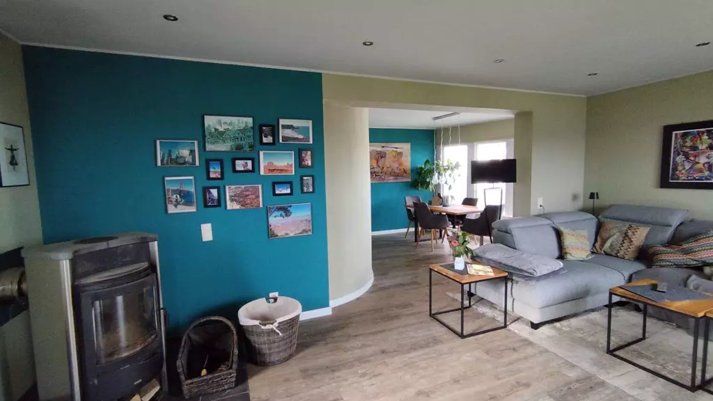 Ein Kaminofen im Wohnzimmer versorgt praktisch das gesamte Erdgeschoss mit wohliger Wärme.
